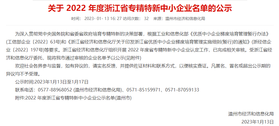 浙江省經(jīng)濟(jì)和信息化廳組織開展2022年度省專精特新中小企業(yè)認(rèn)定工作,已完成相關(guān)審核。近日,溫州市經(jīng)信局公布了2022年度浙江省專精特新中小企業(yè)公示名單,我公司順利通過“浙江省專精特新”中小企業(yè)認(rèn)定。