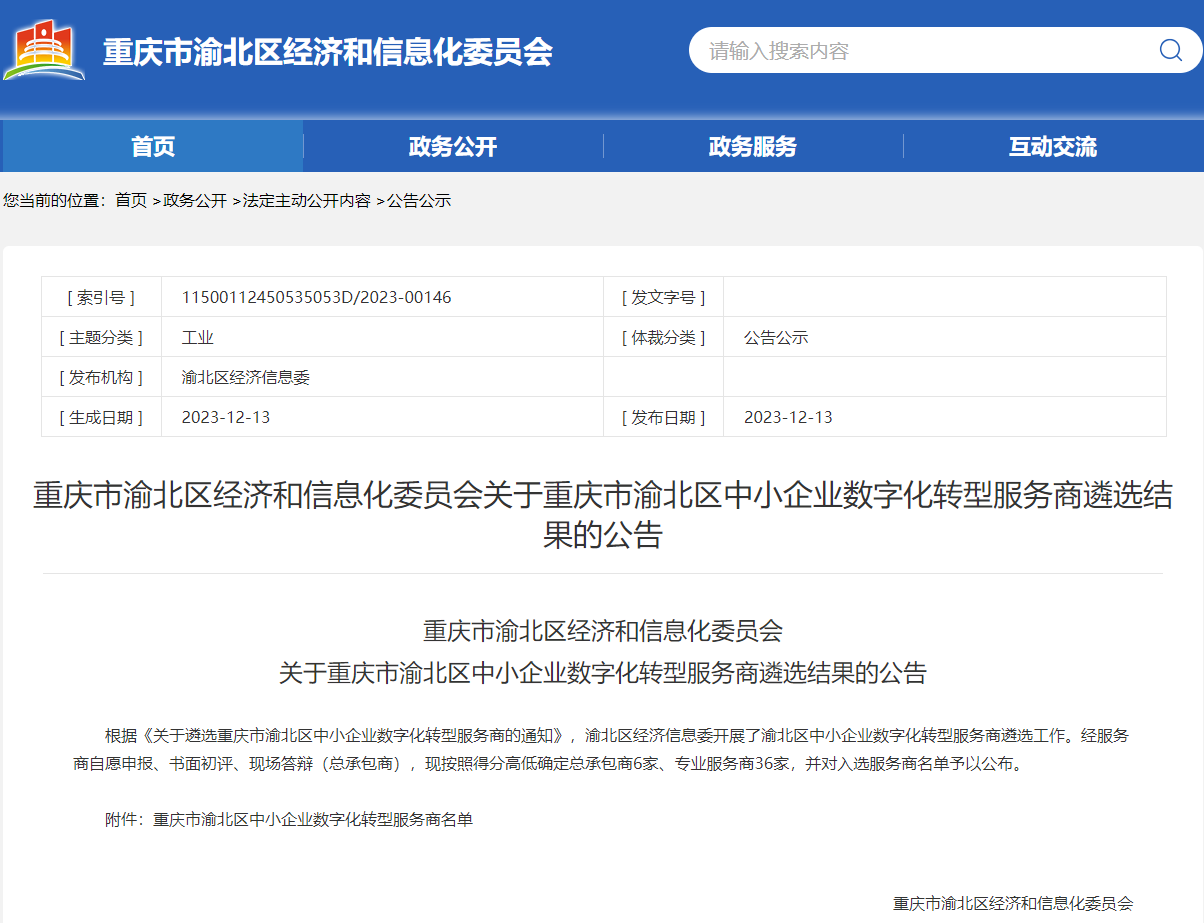 12月13日,重慶市渝北區經濟和信息化委員會公布了渝北區中小企業數字化轉型服務商名單,經服務商自愿申報、書面初評、現場答辯多輪專業嚴格的評審,匯智智能成功入選為智能裝備、汽車零配件專業服務商。